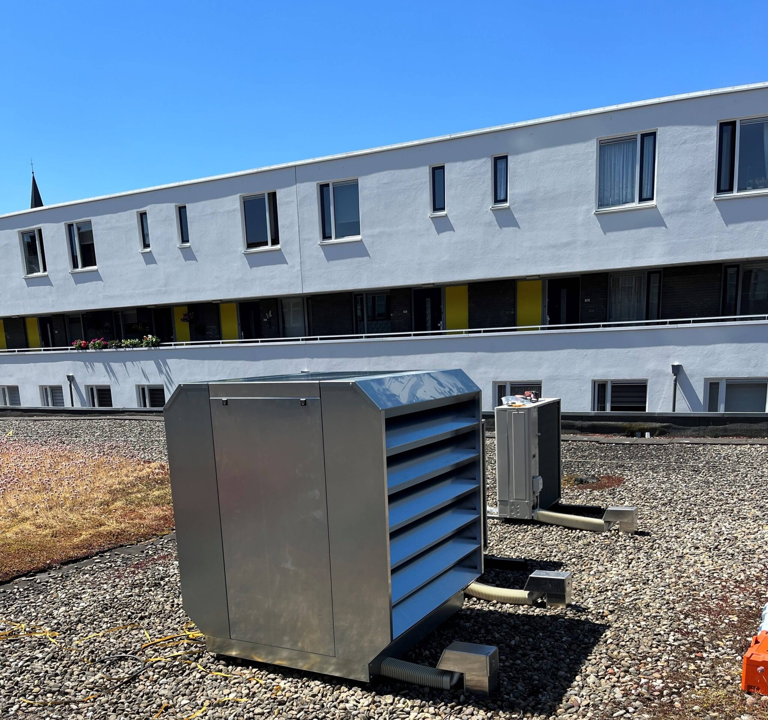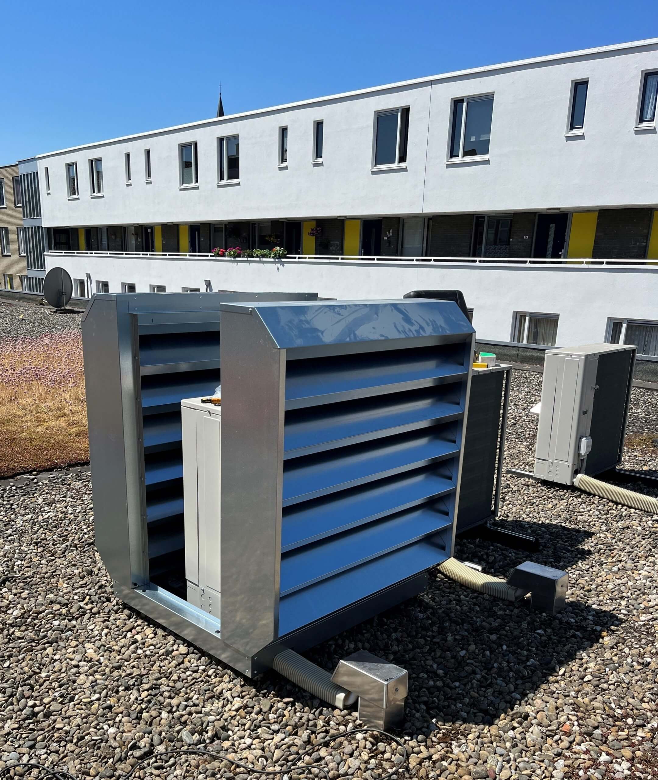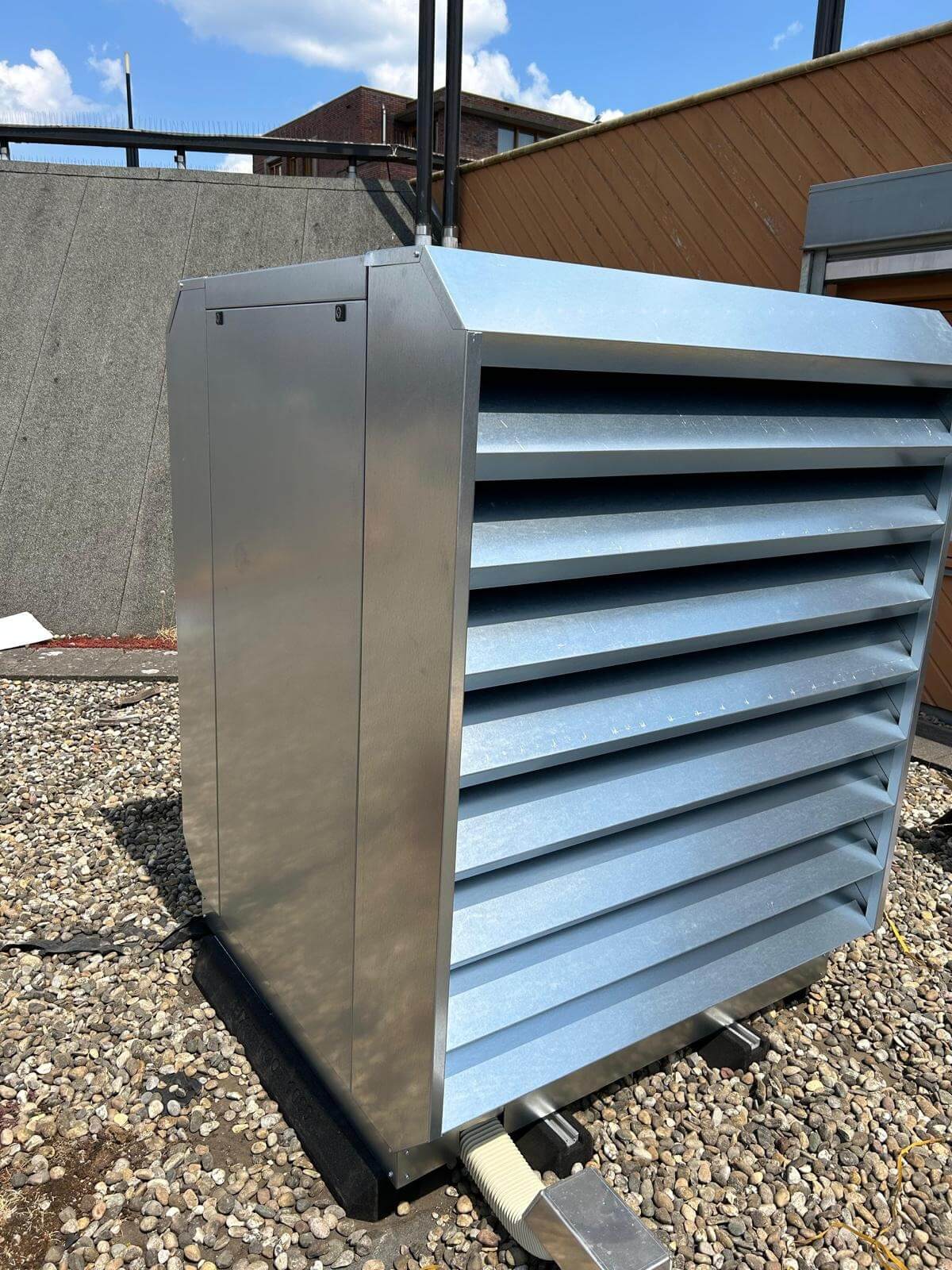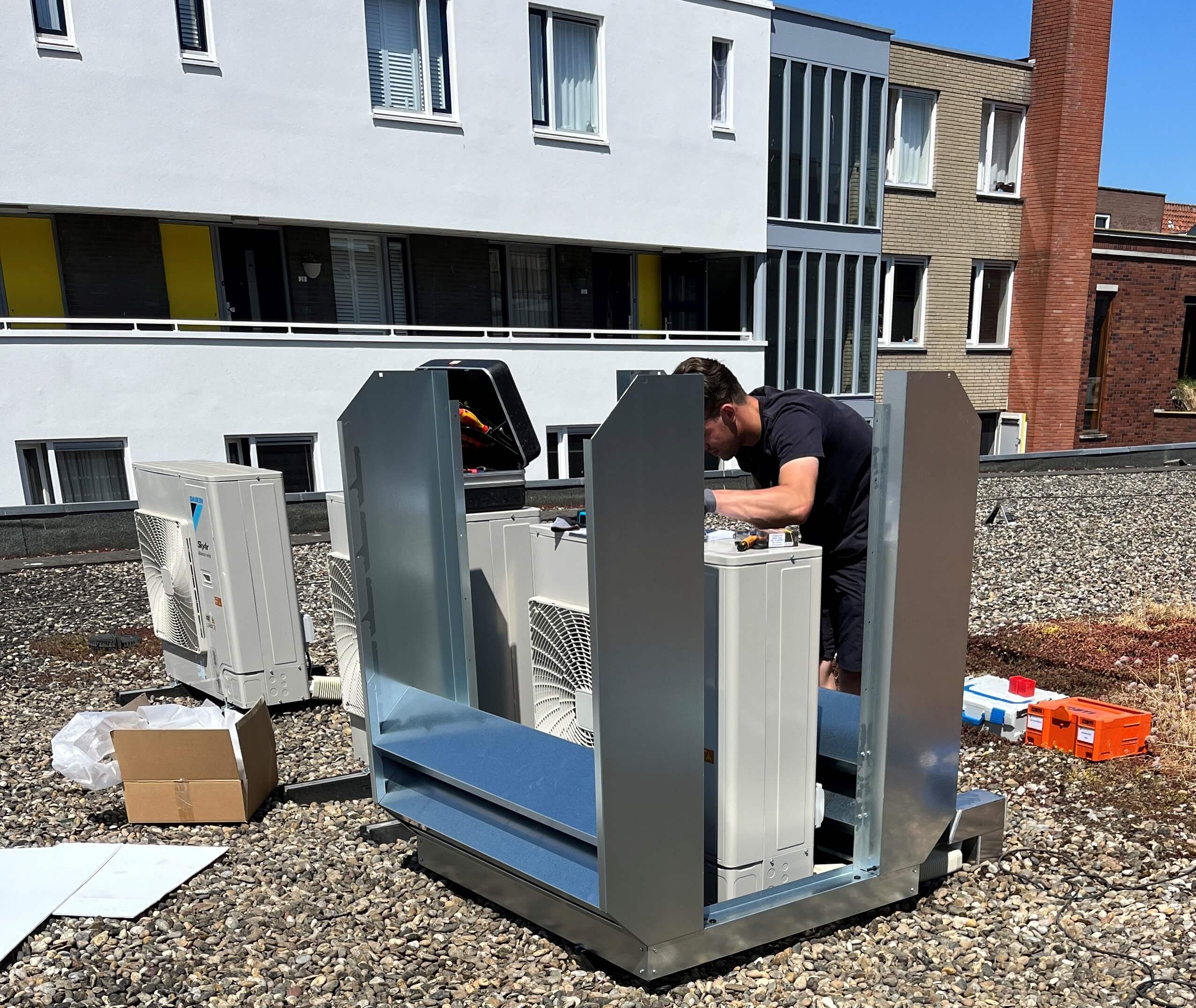 Hoewel de warmtepomp een slimme oplossing is voor het energieverbruik, brengt hij ook geluid met zich mee. En dat was in deze situatie een aandachtspunt: het filiaal ligt midden tussen woningen. Zeker op warme dagen, als mensen hun ramen openzetten, is geluidsoverlast onwenselijk. Er moest dus een oplossing komen die het comfort van de omwonenden beschermt, zonder in te leveren op de werking van de installatie.