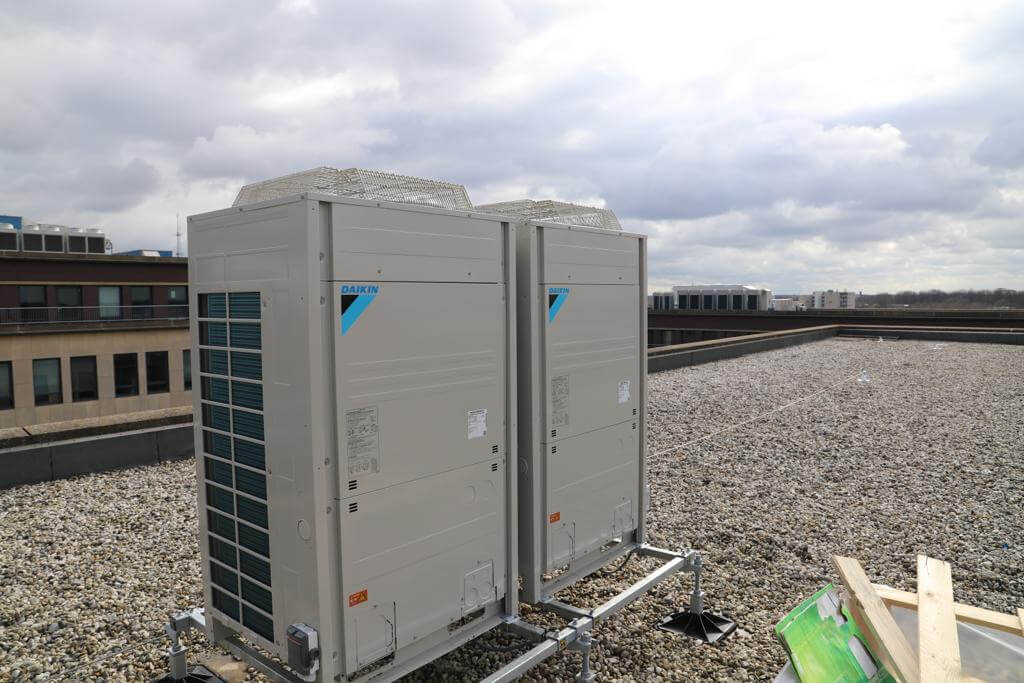 Tetrade II en III werden voorzien van gloednieuwe VRV Heat Recovery systemen. Waar eerder gekozen moest worden tussen koelen of verwarmen, kunnen de ruimtes dat nu tegelijkertijd. De bestaande luchtbehandelingskasten zijn vervangen en voorzien van na-conditionering (koelen of verwarmen) met energiezuinige warmtepompen die zorgen voor een constant en gezond binnenklimaat.